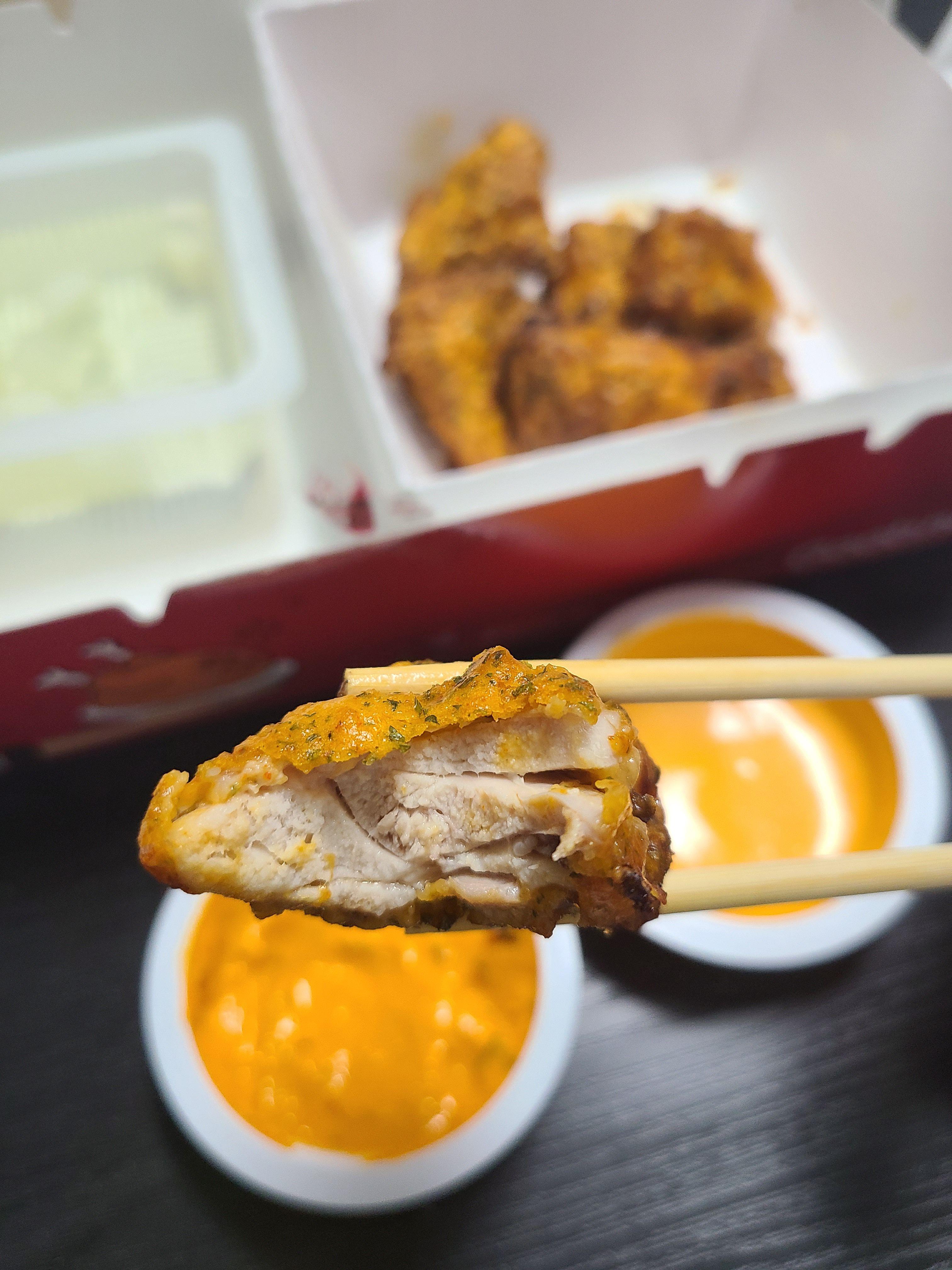 근데 오잉? 속은 굉장히 부드럽고 뭔가 쫄깃한 살이 있었어요. 알고보니 굽네고추바사삭 순살은 다리살로만 순살을 만든다고 하더라구요.