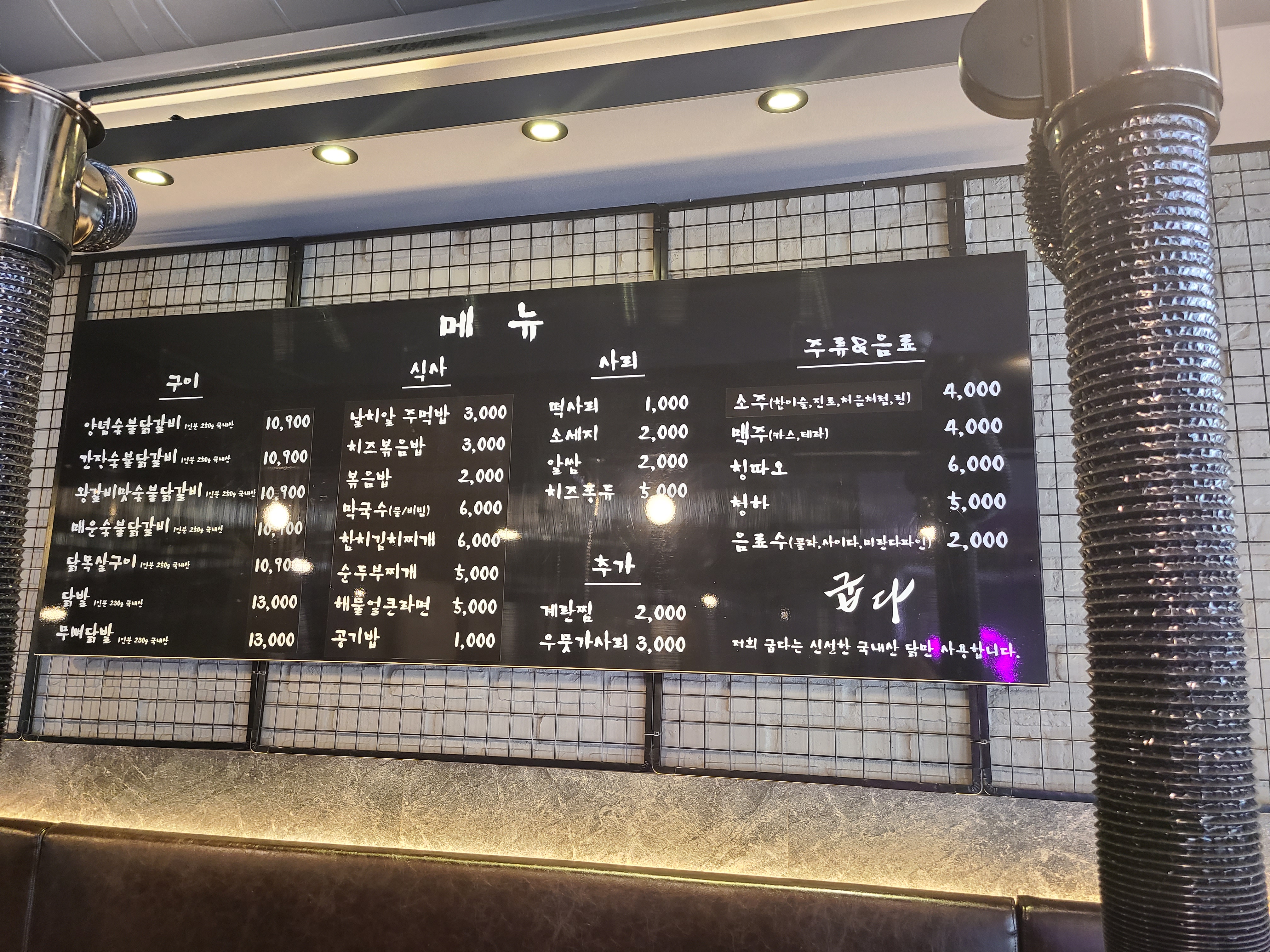 가게 내부는 검은 배경에 깔끔합니다. 실제로 생긴지 2년정도 된 그리 오래되지 않은 가게라고 하고 그래서 다른 닭갈비집 보다 깔끔한 느낌이 나더라구요